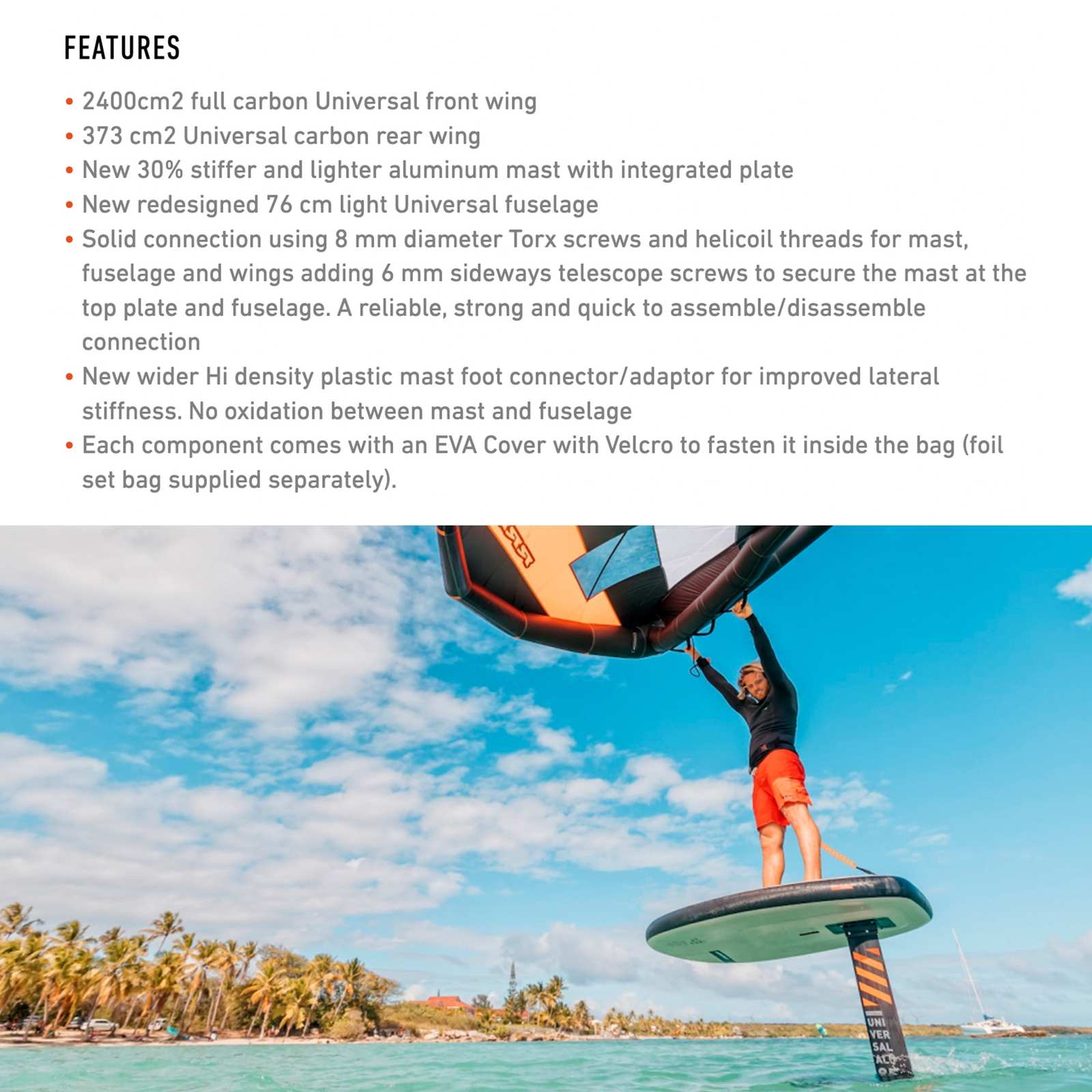 El Set de hidroala Universal Alu Y27 2400-85 de RRD es la herramienta definitiva para quienes buscan iniciar su experiencia en el emocionante mundo del foiling. Diseñado para la versatilidad, permite un fácil cambio entre el uso en Wing, Surf, SUP y Kite foiling sin la necesidad de intercambiar el hydrofoil. Su construcción destaca por un robusto mástil de aluminio, disponible en dos longitudes (75 cm y 85 cm), lo que permite a los principiantes mantener el control y a los más avanzados cubrir distancias más largas. La innovadora aleta frontal de carbono de 2400 cm², con un perfil extra grueso y dimensiones generosas, garantiza un despegue rápido y un aprendizaje eficiente de maniobras. Además, la sólida conexión entre todas las partes del set le otorgan un ensamblaje rápido y seguro, mejorando la experiencia de uso y durabilidad del producto.